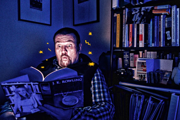 Now a little while ago I wrote a blog entry about becoming a retrogrouch using older film cameras again and enjoying the stripped back experience. Well this shot was all about technology.I used a Canon EOS5d, with a Canon EF28-135mm f/3.5-5.6 IS USM lens. The camera was tethered to my MacBook and I was shooting to Adobe Lightroom. The lighting was to provide the real story here and a Canon 550EX with CTO fired into the book and bouncing back to my face was the key light. I wanted it to look like a warm magic light pouring out of the Harry Potter book. A Canon 430EX with blue filter bounced off the opposite wall at – 2 stops provided the fill light. The on camera WB was set for tungsten as I wanted this to provide a cold foreboding atmosphere. The camera was triggered by a wireless controller so I did not have to keep getting up and I was able to watch the images on my screen and this enabled me to play around with my positioning and facial expressions. Once I was happy I then processed the RAW file in Lightroom and then exported to Photoshop where I used AlienSkin’s Exposure to enhance the look and then added the stars and lightning bolts. It all sounds very complicated but in a little over an hour I had shot the image, processed it and uploaded to the competition site on Flickr. I took up photography in the early 1980’s with an old Praktika SLR and would have regarded all the above as magic … pure magic.