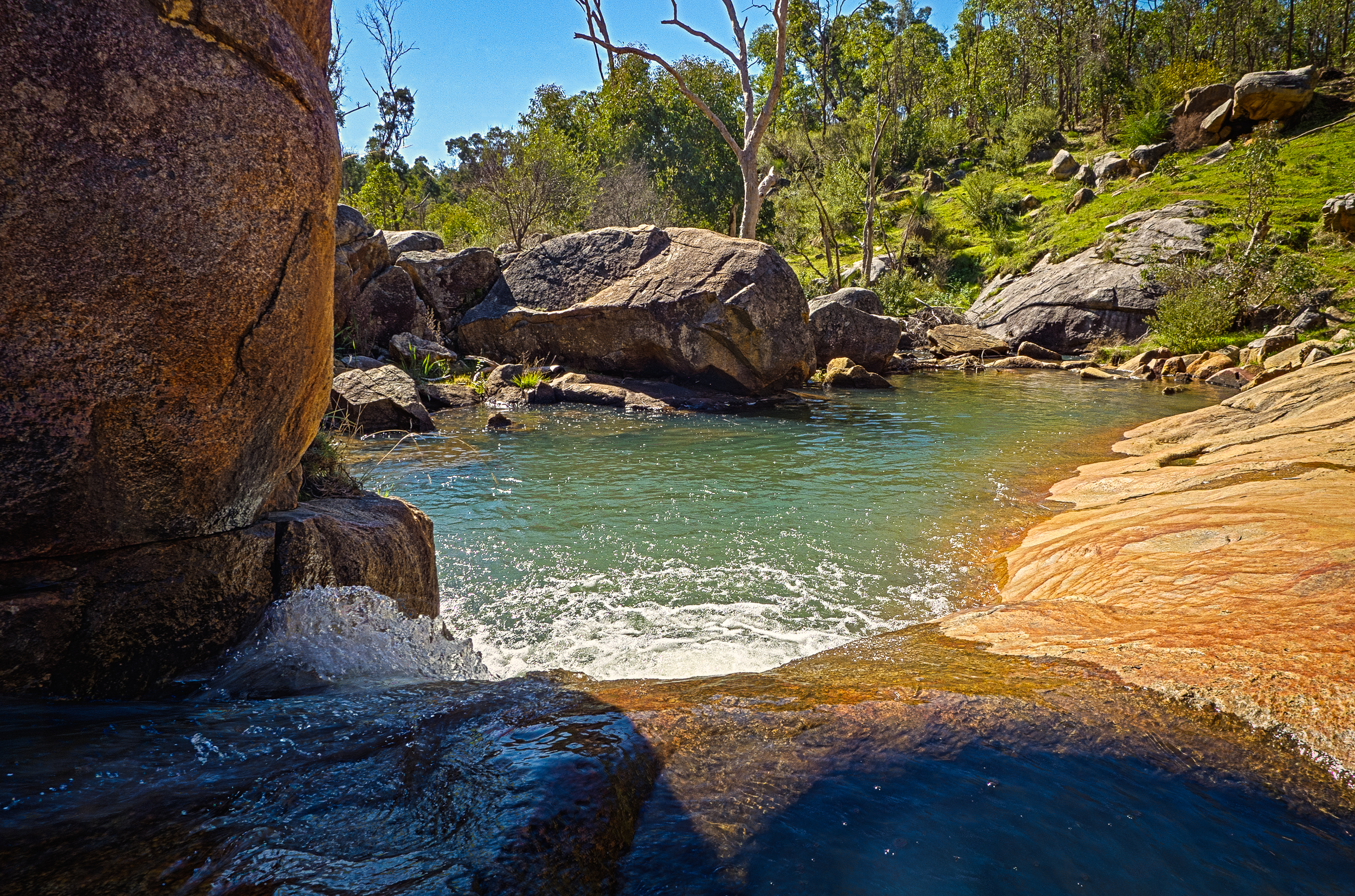 Yesterday was one of those beautiful winter days that makes living in the south-west of Western Australia so worthwhile. It had been a cold clear night and we woke to a crisp morning with temperature expected to rise to 23℃ – better than some country’s summer. So my partner and I decided to walking in the Darling Range just above Perth and we walked along Piesse Brook to a place called Rocky Pool which is a picturesque little spot. Once we got there my partner decided to sit and cool off her feet in the water and I decided to take a couple of shots for the relatives such as this one: