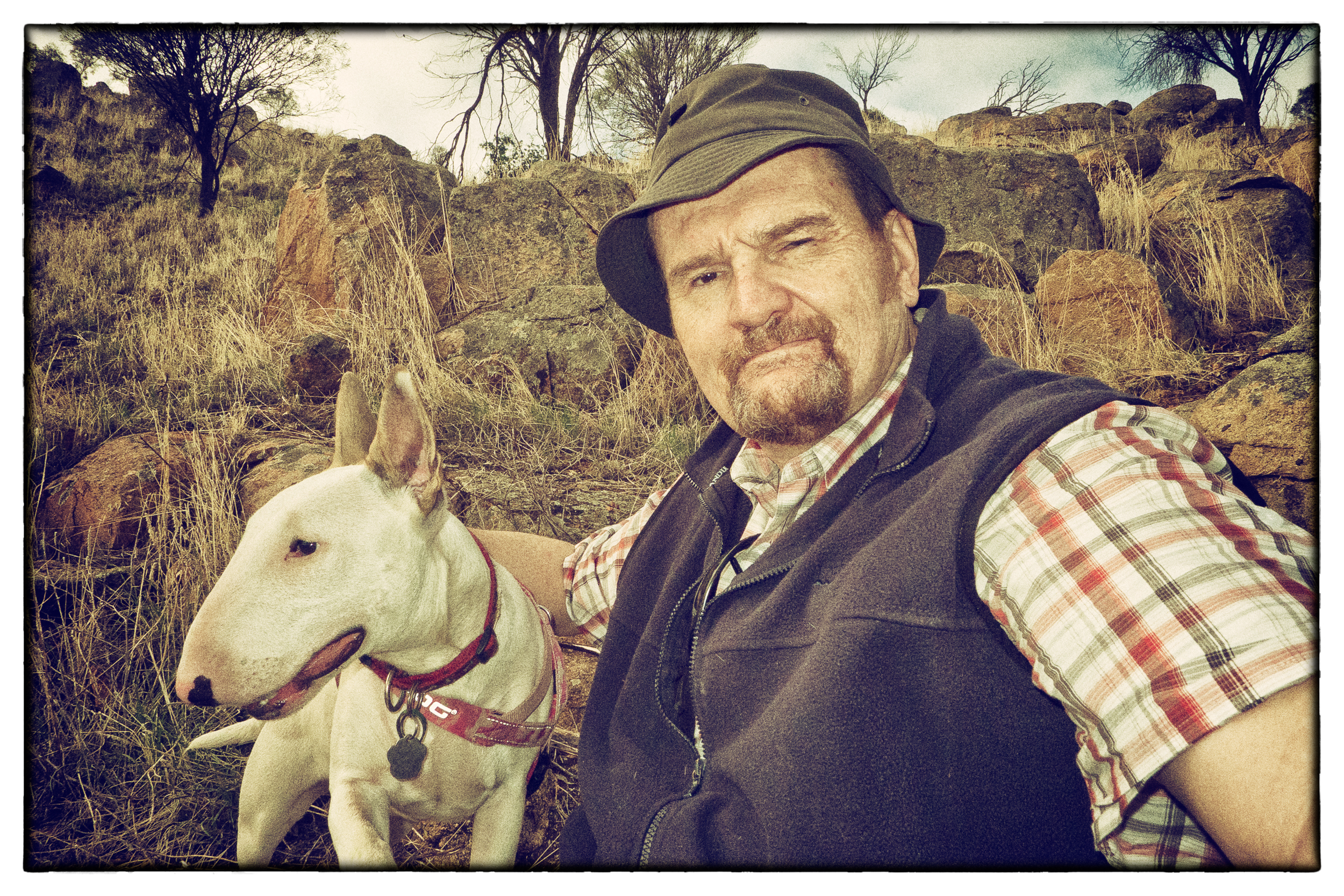 I must say I don’t take “selfies” very often, but this morning I thought I would as it is not every day you turn 50 and I wanted to mark the occasion somehow.I’d left the house to take Frida (aka the puppy piranha) for her morning run and I’d put my Panasonic LX5 in my pocket. When the creative urge struck I thought this’ll be a piece of cake – birthday or otherwise – as I’ll just put the camera in self-portrait mode and snap away. On checking the LCD screen I saw that the shots were a dismal failure – the sky was over exposed and I was under exposed. Thankfully over the course of my fifty years I have learnt a photographic trick or two so I put the camera in manual and set a shutter and aperture combination to under expose the general scene by 2 stops. I then activated the pop up flash and set it to under expose by 1/2 a stop. The icing on the cake was getting Frida to sit with me while I took the shot. On getting home the image was fed through Lightroom and I played around with newly re-launched Nik Software Collection to make my visage suitably aged and distressed looking.