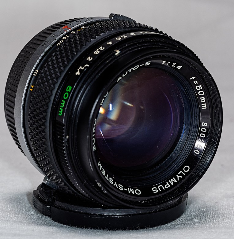The first lens most people whack an adapter on is a fast standard. The 50mm f1.4 was one of the original lenses that was introduced when the OM system was launched at Photokina in 1972. The original silver nosed (a term referring to chromed front mount ring) had a single lens coating and was 36mm in length.The newer MC version was introduced in 1984. Along with the new improved lens multi coating the design was changed resulting in a length of 40mm with a weight of 280g. The lens construction is seven elements in six groups. Despite being a fast lens it has a modest size and has a 49mm filter thread.