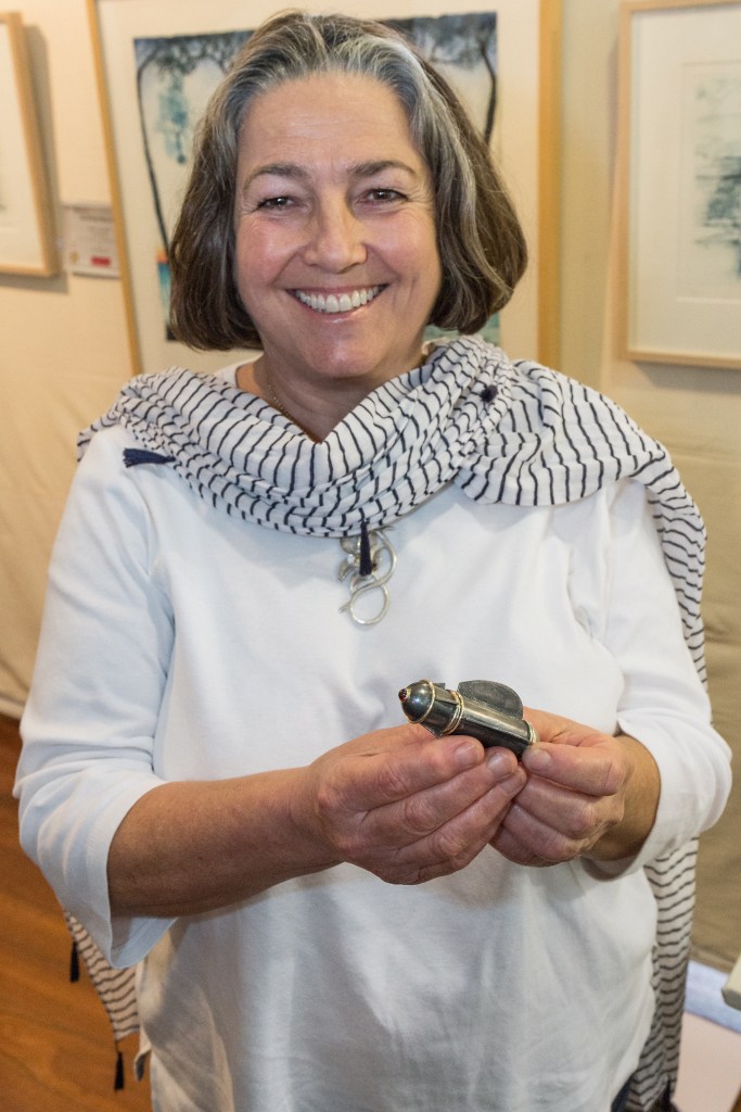Louise won the Works in Fine Metals & Jewellery category with her work “Pocket Rocket“. So knowing that the pictures would be as dull as ditchwater I decided to take some alternatives after the ceremony. So the picture below shows the artist with her artwork looking very happy. So this tells the viewer something more than thefirst one. A big improvement, it is informative, happy and visually interesting.