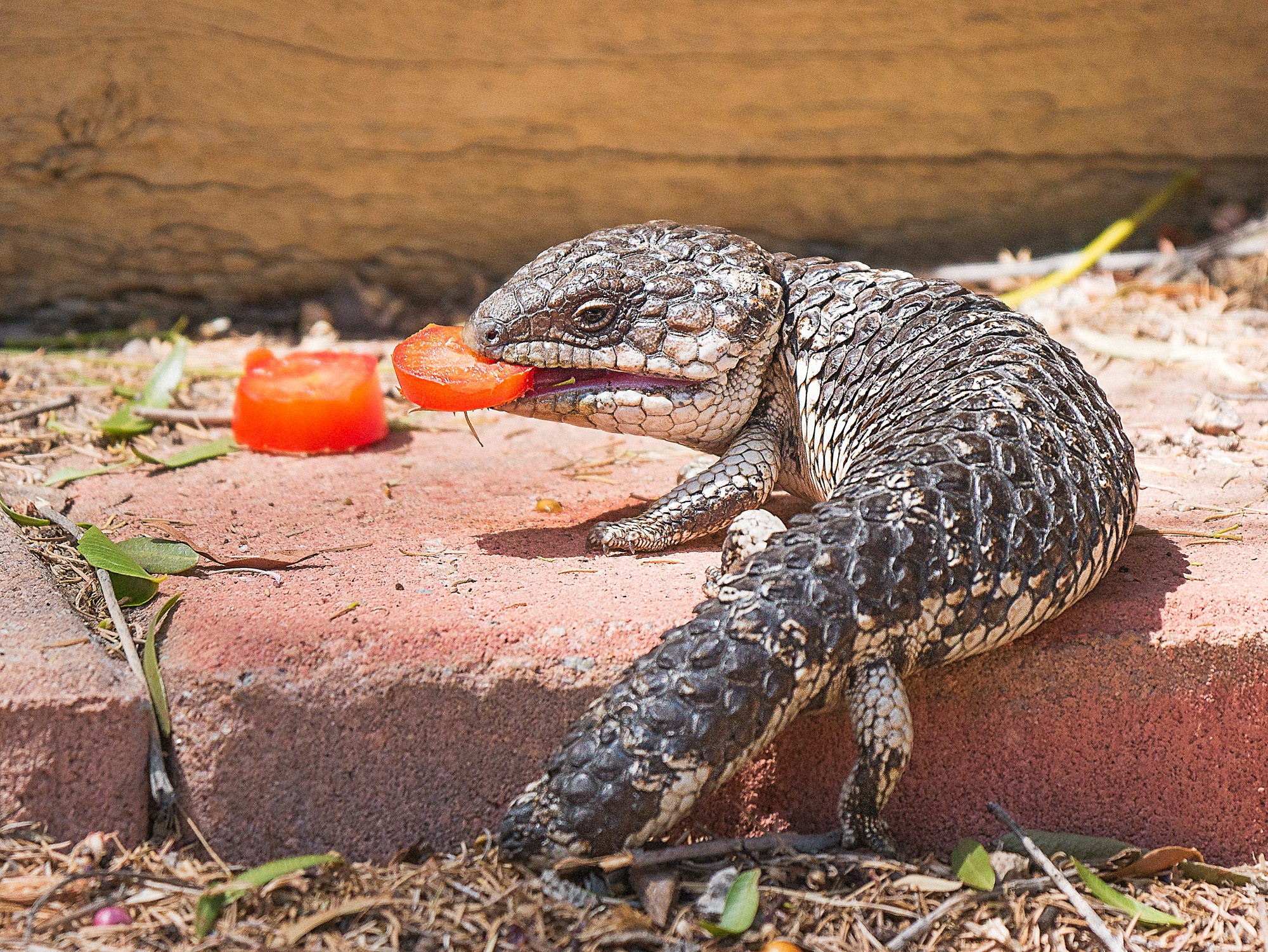We have at present three bob tailed lizards (Tiliqua rugosa) living in the back garden. There’s Big Bob – he’s big male who must be very old judging from the size of him. He’s been here the longest and when he got sick with bobtail lizard flu one winter a couple of years ago we had him inside the house to help him get over it and then tucked him up under a pile of leaves for the remainder of the winter. Just a couple of weeks ago I heard this thrashing about under the sofa on our back patio and when I went and looked it was Big Bob mating with a smaller sleeker female who I called Mrs Bob (hey I can’t be stunningly original all the time!). They are unlike other lizards monogamous and give birth to live young so we’re looking forward to the new arrivals. Little Bob made an appearance on the patio this morning, he’s significantly smaller than the other two so I guess he’s not very old. They are omnivores and very partial to fruit – strawberries being a favourite – so I sliced up a cherry tomato and he/she scoffed the lot very quickly. As they also eat snails and insects I’m hoping that having three of them will mean that they keep the garden pests down. There’s also a bit of an old wives tale that says if you have one in your garden it’ll keep snakes away. I dunno if it’s actually true or not, but having three has got to be good.