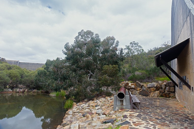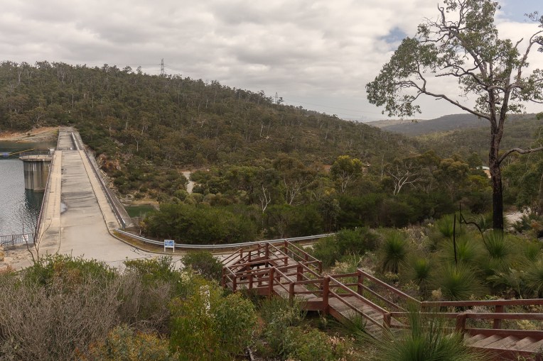 The original dam was built in 1891 and pumped water via pipelines to Kings Park and a reservoir there on Mount Eliza. The dam became the first permanent water source for Perth and was operated by the private City of Perth Waterworks Company. As the water catchment area took in agricultural land and timber settlements there were fears that it would be polluted by raw sewage and excrement from livestock. Between 1895 and 1900 typhoid broke out in Perth and 425 people died. The water was tested and found to be contaminated so the government took control and made changes to prevent re-occurrence. By 1988 the concrete structure was beginning to degrade to such an extent it could no longer be repaired so in 1990 work on the new dam commenced and because of the use of roller compacted concrete it was completed by the following year. It can hold 9.5 million kilo-litres and is used to supply drinking water to Kalamunda and Lesmurdie.