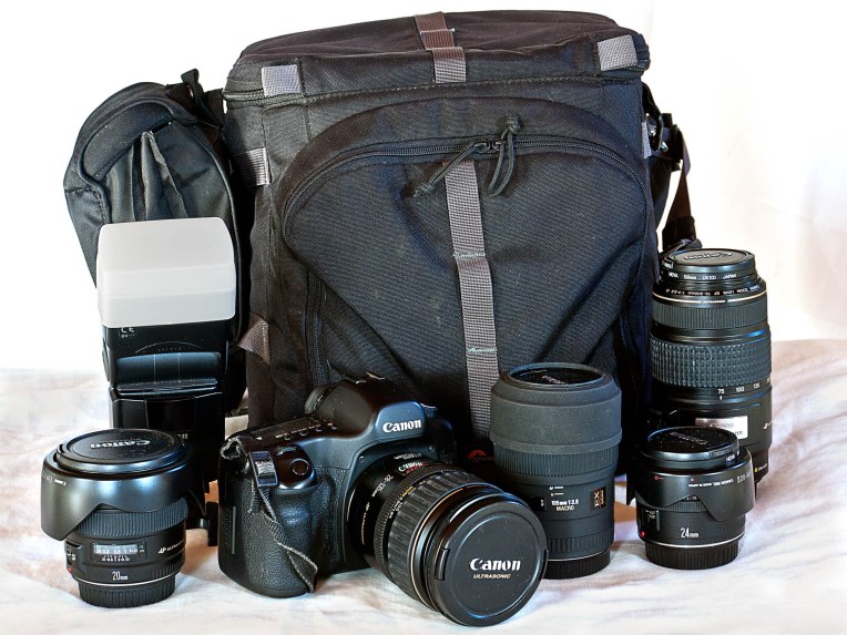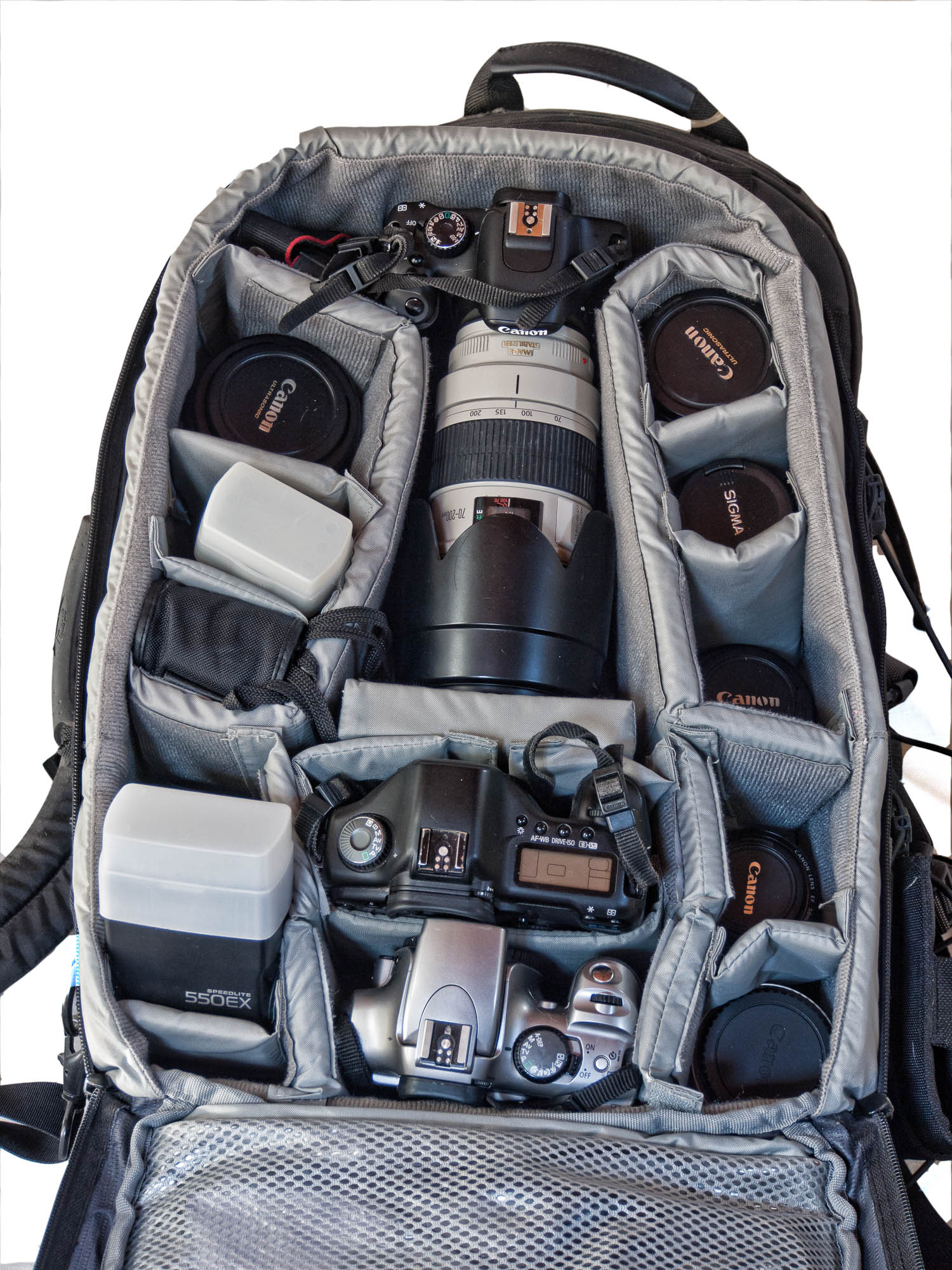 The Canon EOS system full monty. Three bodies, seven lenses, two flashes, flash meter, filters, cables, flash triggers, and reflectors. It is a hernia inducing load.