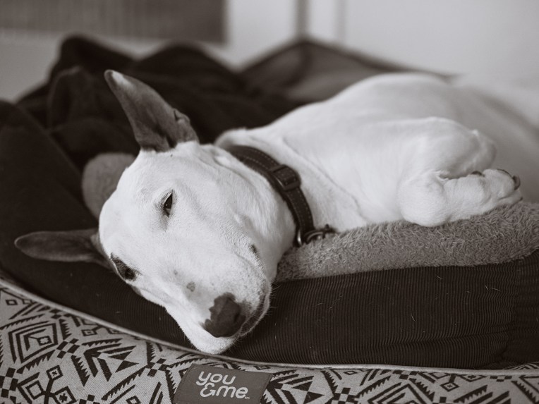 This is the natural state of the English Bull Terrier. Most people have this image of them being highly aggressive canine fighting machines, but the reality is that they prefer comfortable beds, cuddling up to blankets or preferably people, and sleeping.