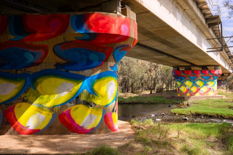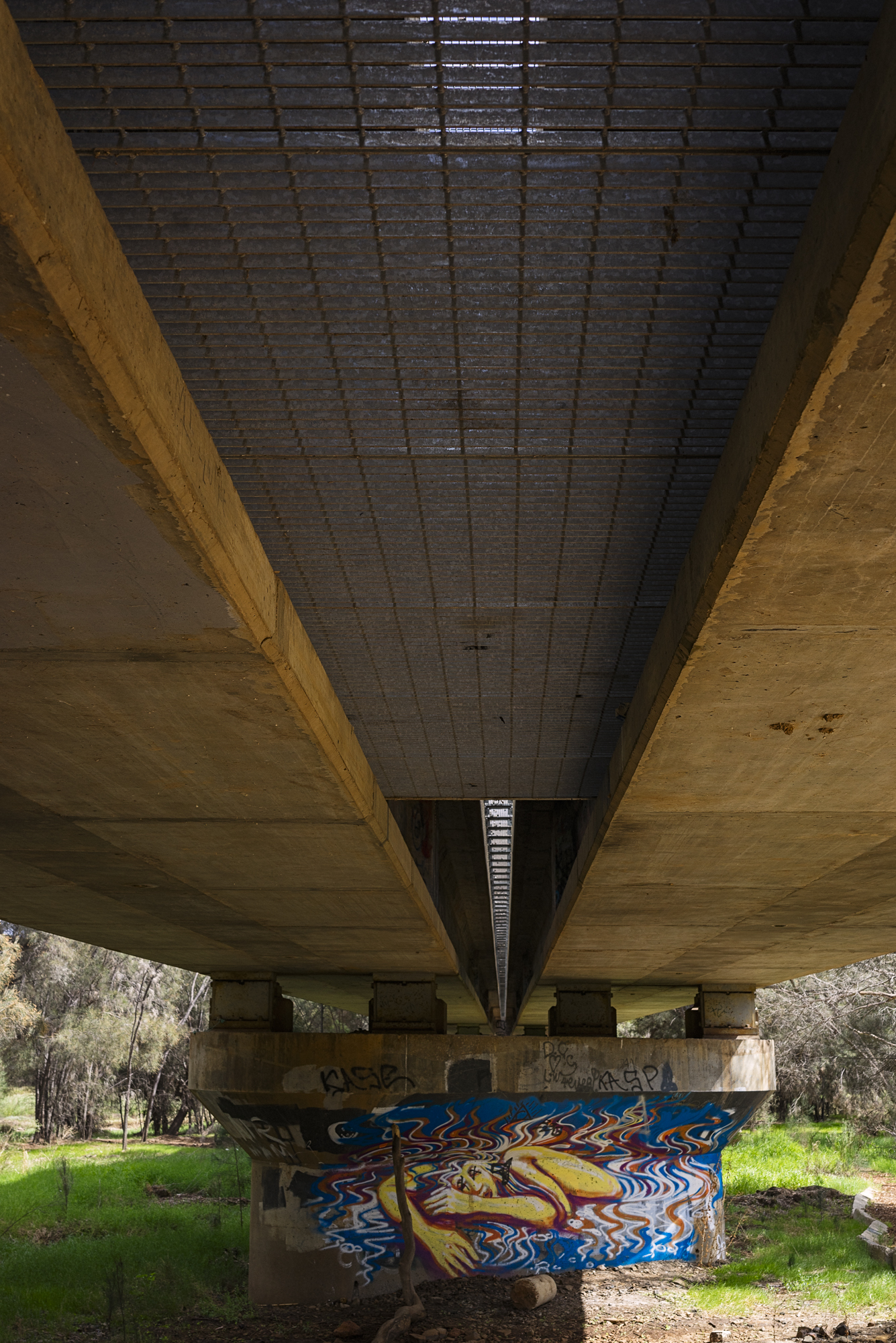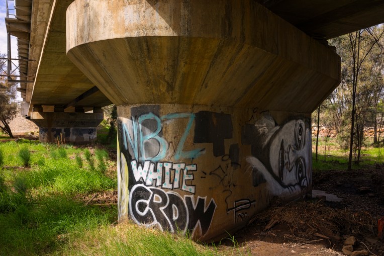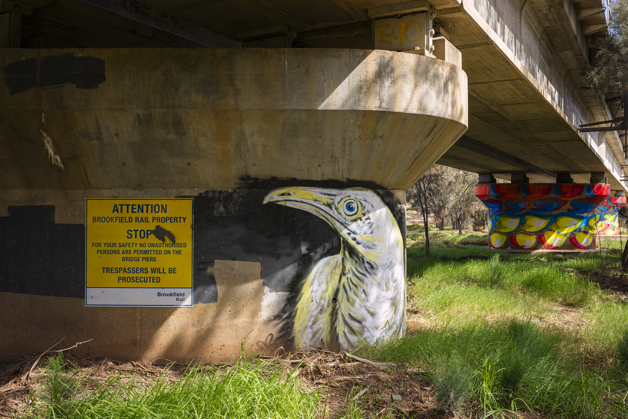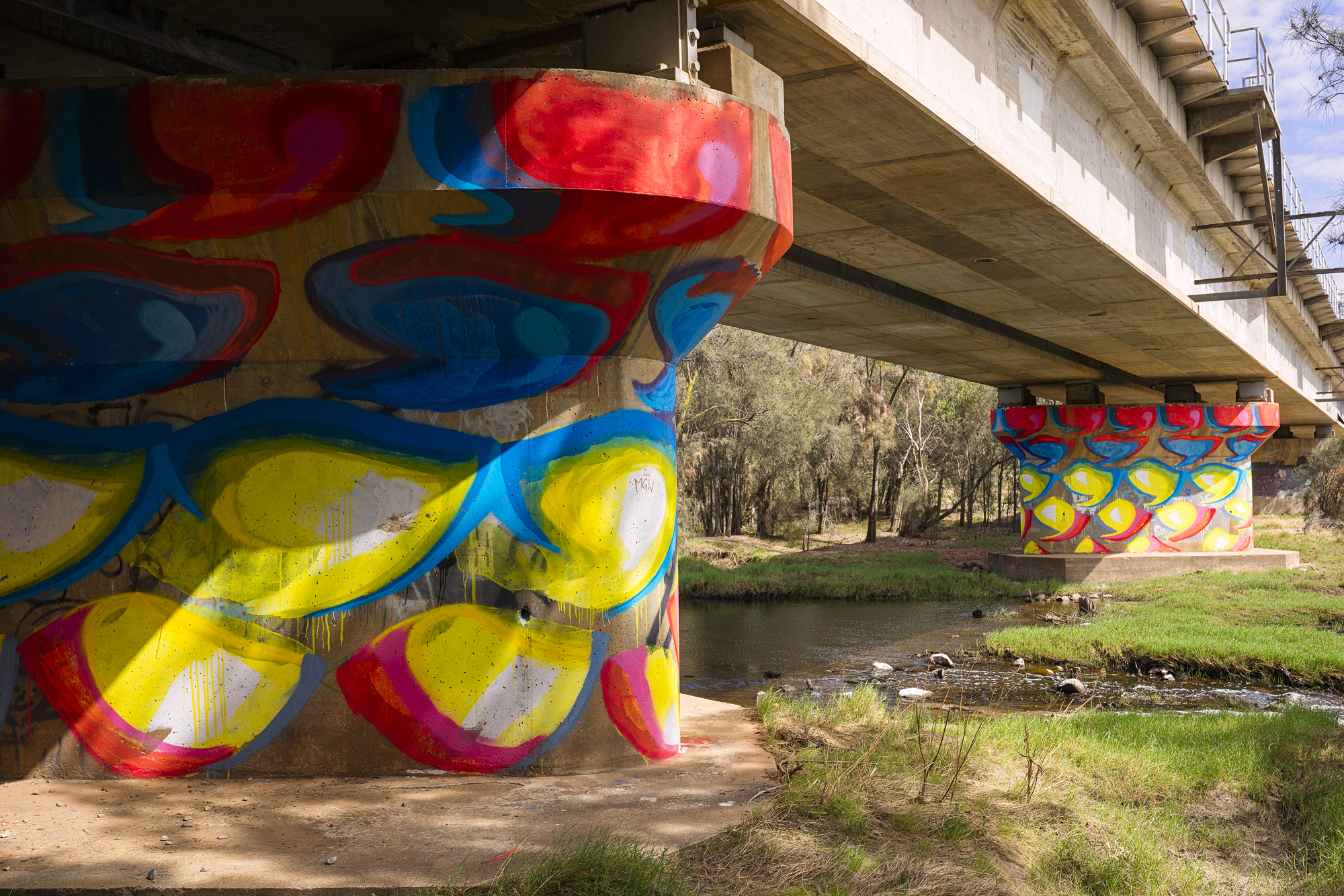 Graffiti is a subject that seems to upset a lot of people – especially members of the “hang ’em high” brigade. Personally I don’t get bent out of shape by it, and in fact some I even enjoy. The other day we were walking in Enright Park in Northam and we ventured under the Brookfield Railway Bridge and we were treated with an extensive graffiti gallery which I quite liked.