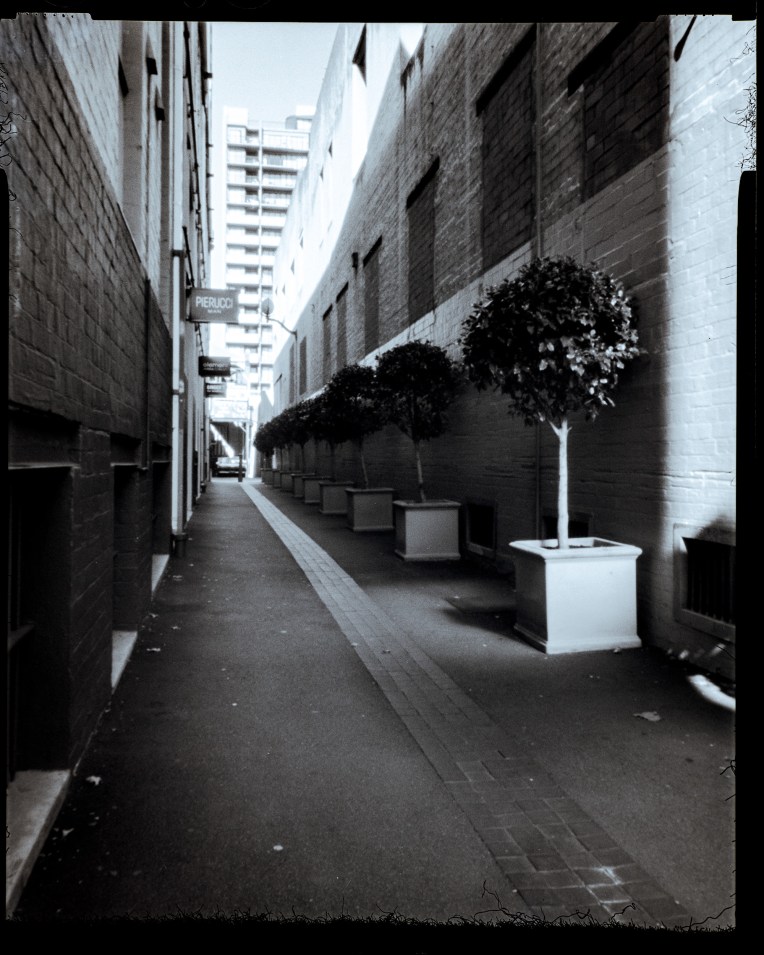 The photos accompanying this piece were taken with a camera that does not have a lens. It is a 4×5 pinhole camera with a focal length of 150mm and an aperture of f256 which when using Ilford FP4 developed in Ilfosol 3 gives an amazing amount of detail and clarity considering that no lenses are involved. I like to think that it is my anti technology camera. No lens, no focusing, no shutter mechanism, no film advance, no metering, no viewfinder. A successful picture required a great deal of serendipity and that is part of its charm.