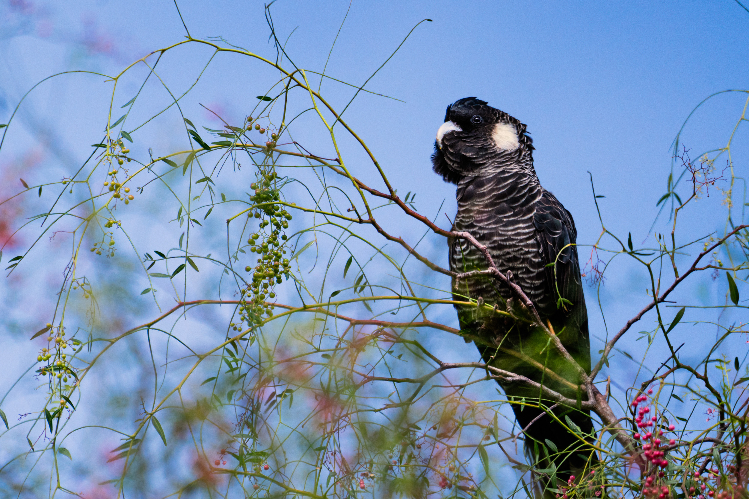 The other I was sat in my office pouring over the incomprehensible bumf sent out from an insurance company when I heard a commotion outside. There was a load of raucous squawking coming from the back garden. I picked up a camera and ran out to see what was going on. To my delight it was a flock of Carnaby’s Black Cockatoos. They are classified as an endangered species but are commonly seen in the Wheatbelt. I get quite a thrill seeing flocks of them flying but it was taken to another level to see them in the garden.