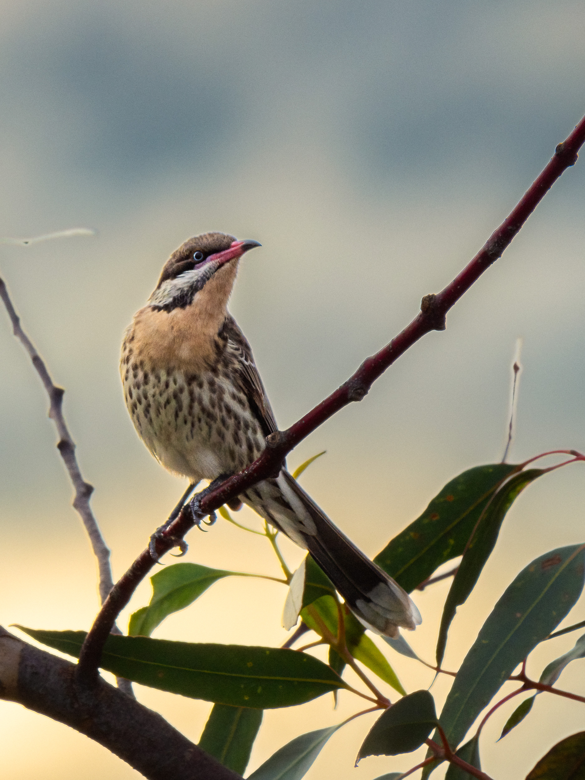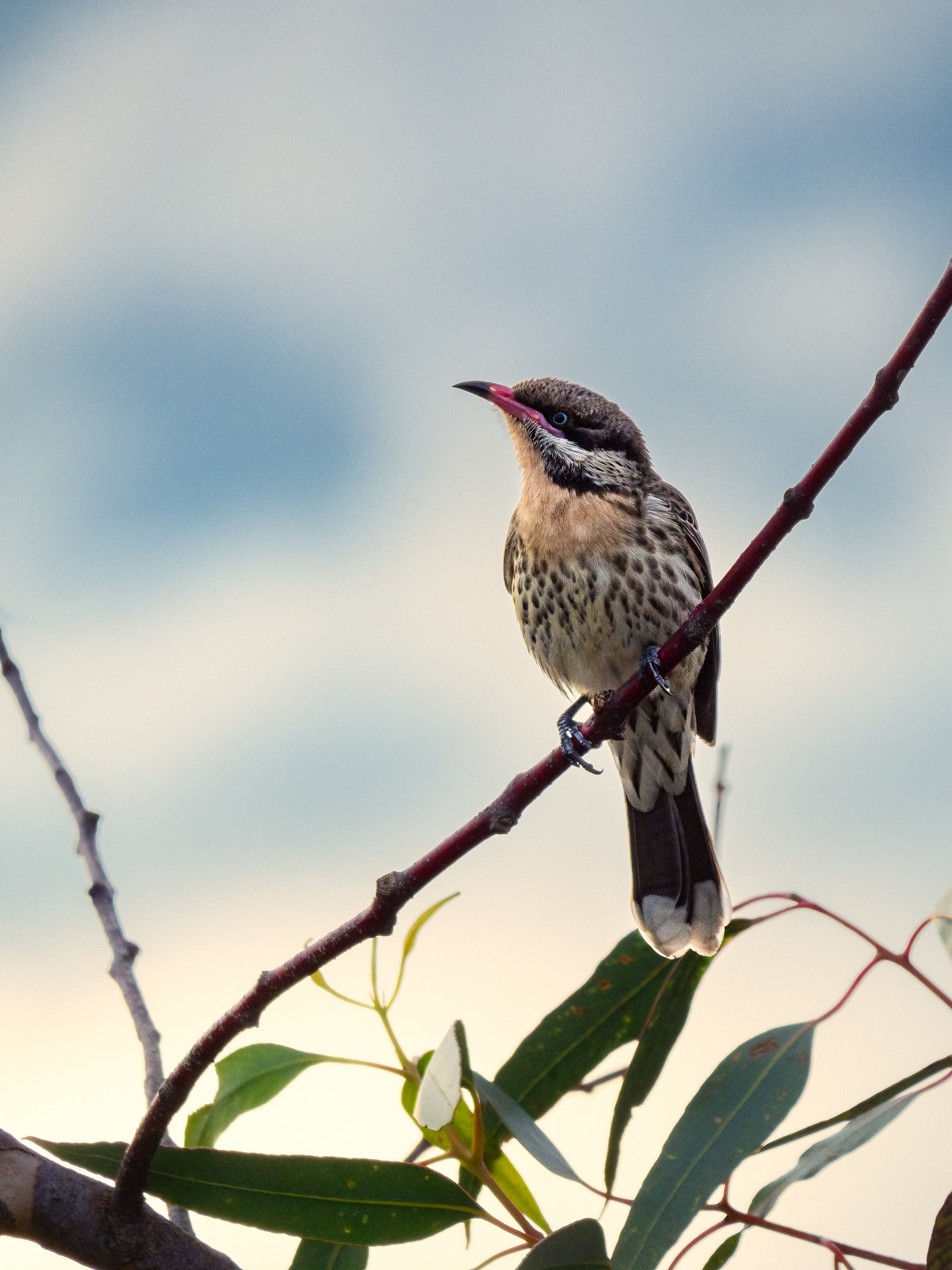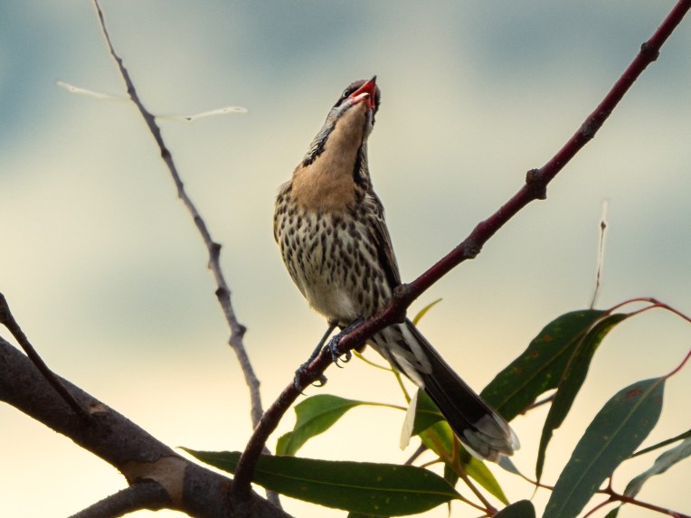 We were sitting on the front veranda the other evening when we heard this amazing bird song. Looking up was a bird we’d not seen in the garden before – a Spiny-cheeked Honeyeater. Of course this warranted getting a camera and taking a few shots.