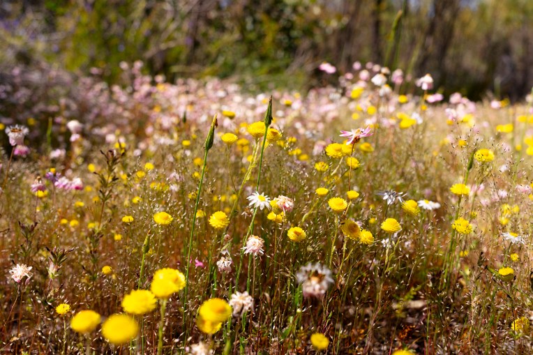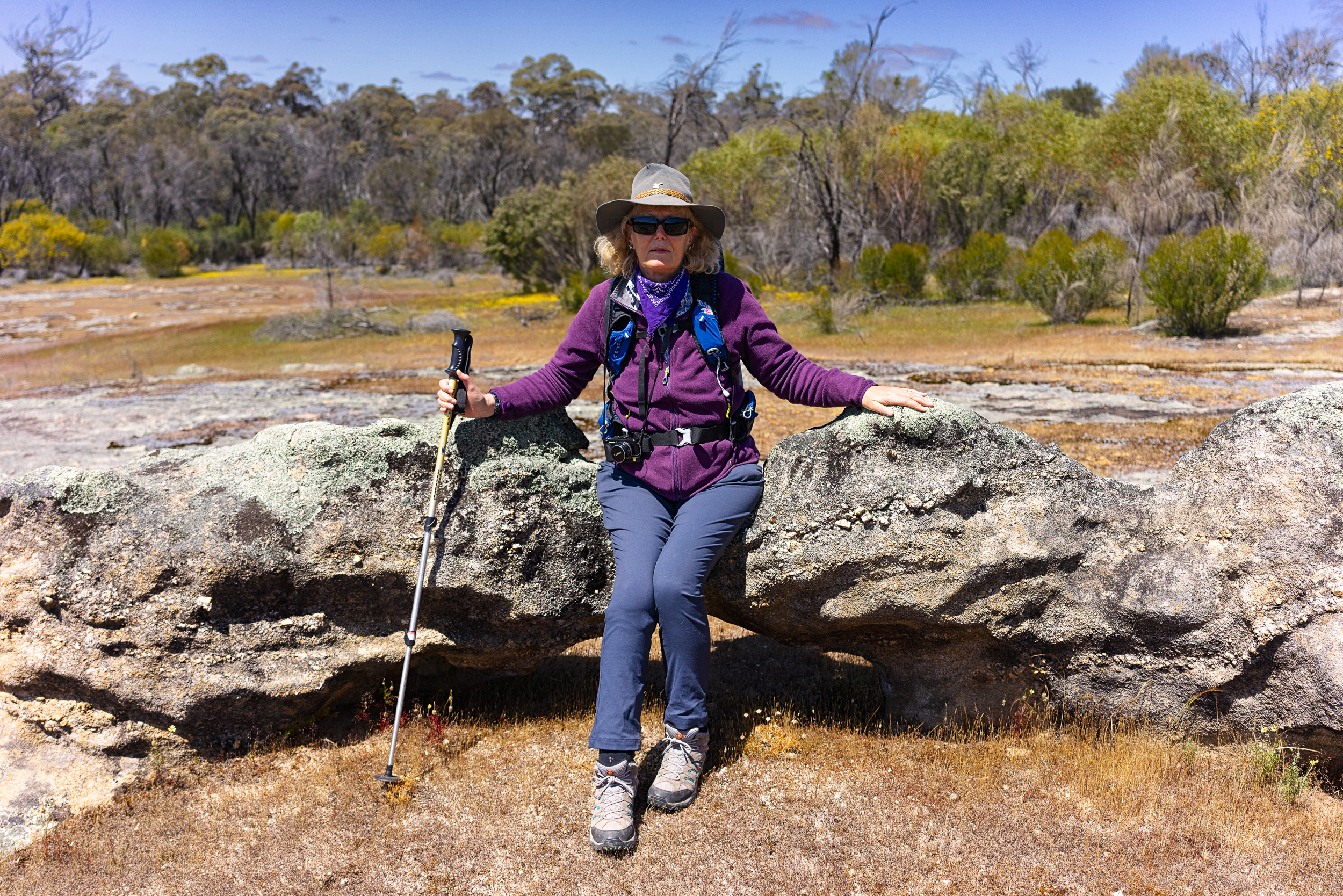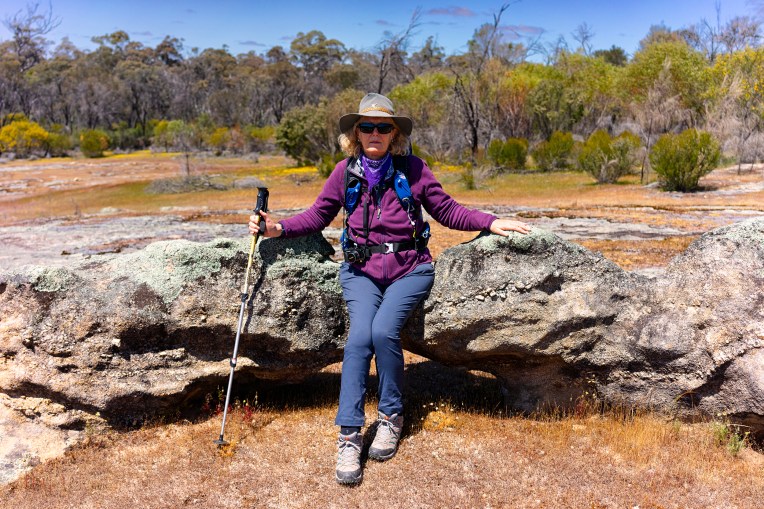 It’s not the first time we’ve visited, but this time it wasn’t wet which made walking across the granite a lot easier because when it is wet it’s like walking across an ice rink . The bush around the base looked terrific with lots of flowers out and birds calling from the trees. We were hoping to see dragon lizards basking on the rock itself, but there was a slight nip to air that was enough to keep the lizards in the shelter of the crevices. We flushed some Australian Pipits as we walked up, unfortunately I didn’t have a long enough lens to photograph them. As we walked up onto the granite Helen had a close encounter of the spiny kind with an echidna – it was a bit on the shy side and curled up in a ball at the bottom of a tree.