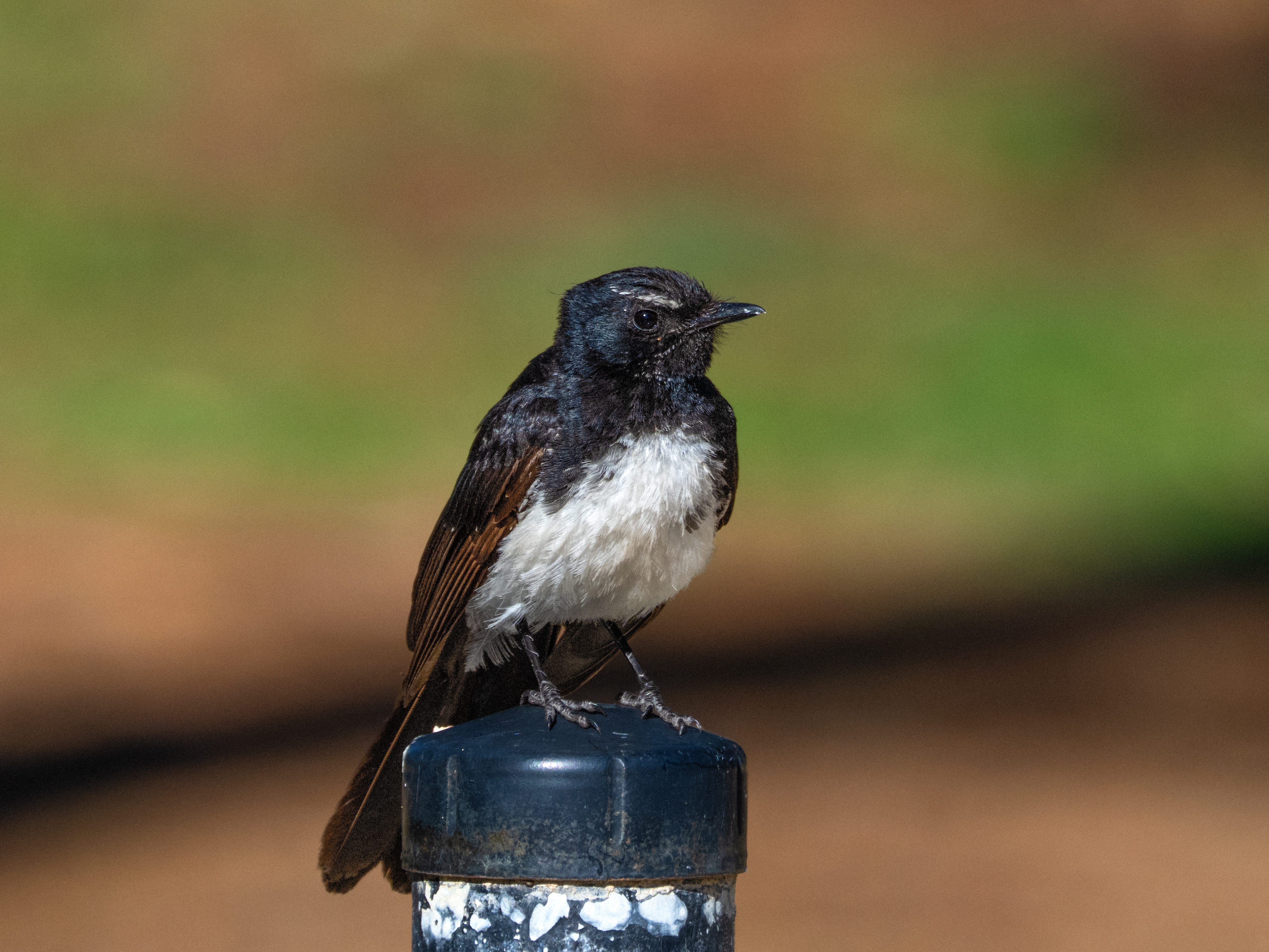 Willie Wagtails make incredibly tiny nests – smaller than a tea cup. The typical clutch of eggs is 2-4 which is fine until they hatch and then overcrowding sets in. I spotted this nest while walking back to the car. It looked quite a comical situation – 2 adolescent Willie Wagtails just about ready to fledge crowding round this tiny nest with one in it. All three looked incredible grumpy – it’s the eyebrow and the down turned mouth that gives that impression. One of the parents was sat on a fence post just 5m away closely watching. I was very surprised it didn’t try to chase me off as Willie Wagtails are incredibly aggressive and territorial. Perhaps it was too knocked form taking care of the chicks.