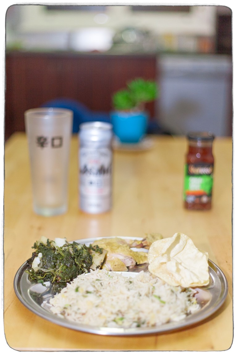 Been left on my own for the weekend means it’s time for a curry extravaganza. Here we have Murgh musallam (baked chicken), Saag aloo (spinach with potatoes), Khili hui khichri (rice with yellow split peas) , popadoms and some ginger and mango chutney on the side. All this washed down by Ashai Dry.