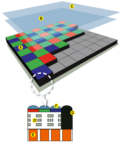 However, it is not all unicorns at the bottom of the garden. Rangefinder lenses were designed for use with film and the silver halide crystals in the film emulsion did not care at what angle lights hits them to provide the necessary reaction to form the latent image. But with a digital sensor it is a whole different ball game because the sensor is no longer just a gelatine substrate coated with an emulsion containing silver halide crystals it is a complex sandwich of filters, lenses and electronic componentry as the schematic from whatdigitalcamera shows. For best performance the light needs to enter micro lenses at 90º, when the incidence of the light is severely off perpendicular then not all of it reaches the pixel at the bottom of its well this can cause vignetting, smearing with loss of detail, and severe colour fringing. This is what stopped Leica initially developing a digital range finder. Kodak developed a special sensor with offset micro lenses for Leica M8 to help overcome this along with in camera software correction the digital M became a reality.