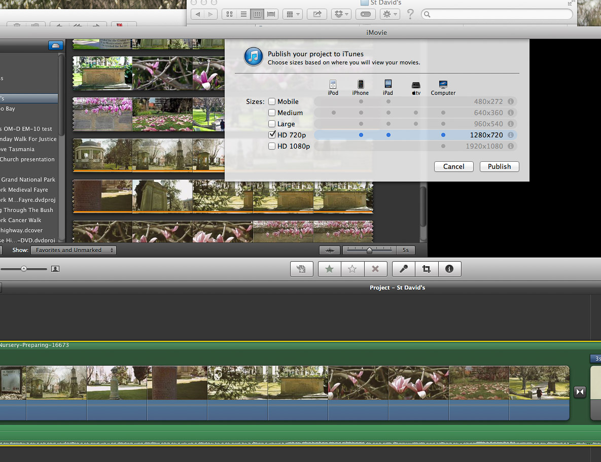 – Last but not least, this when I drop the music sound track onto the project if I’m using one. Check it all to see it’s what I want then I export to iTunes and upload to YouTube or Vimeo. If I’m making a movie for family I send it to iDVD to make a DVD that will play on a standard DVD player. This is of course at standard definition rather than HD.